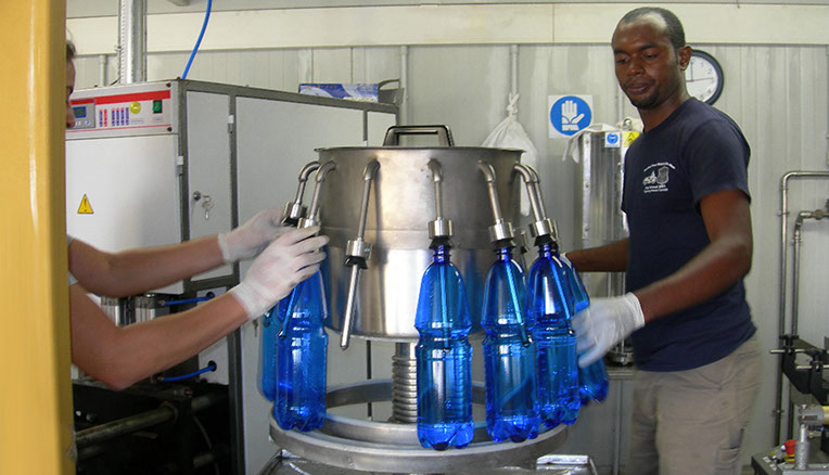 Our WATER TREATMENT PLANTS for potabilisation of water, blowing and forming of PET capsules, filling, tapping and labelling can treat both fresh water and salt water coming from lakes, rivers, sea, wells or marshes and can be easily used by a small staff. 5 people can manage a regular productive cycle but, in conditions of low productivity, only 2 are necessary (*). Water is purified by means of a series of active carbon filters, reverse osmosis process and UV rays that guarantee a perfect sterilisation. WATER TREATMENT PLANTS enables you to produce bottles ranging from 0,5 liters to 10 liters by simply replacing a tool.